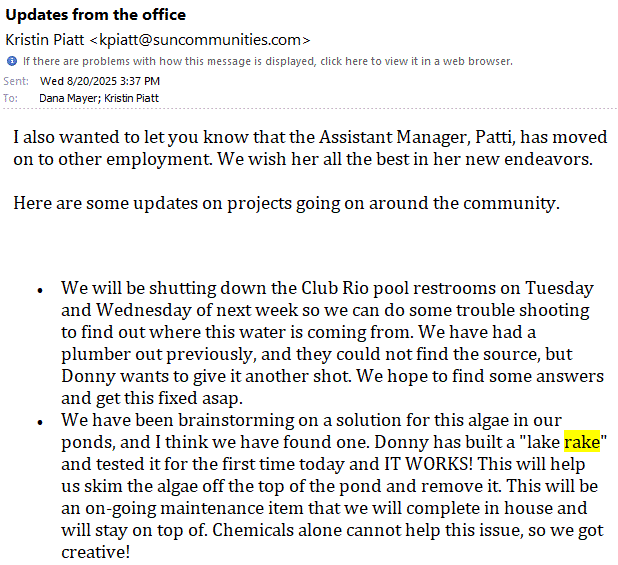 EMERGENCY ALERT Hacienda Del Rio, Edgewater, FL The Hacienda Del Rio HOA/HOC must initiate legal action against Sun Communities for the proposed rent increase of 5% for 2026! The 5 % rent hike at Hacienda Del Rio isn't the problem, the problem is that Sun Communities thinks it deserves any rent increase in lieu of its continuous failures to its residents and tenants!!! Sun Communities should receive no increase until it fully satisfies the commitments it made in the prospectus to its long standing, loyal residents. Those residents have been systematically denied the services they pay for, which has eroded property values and damaged the park’s reputation. The residents deserve some form of compensation or reparation for the repeated failures and the unacceptable treatment they have endured from Tiffany Najera over the past five years, as well as the cumulative 3.1 years of amenity closures that have occurred over the last 4 years. |