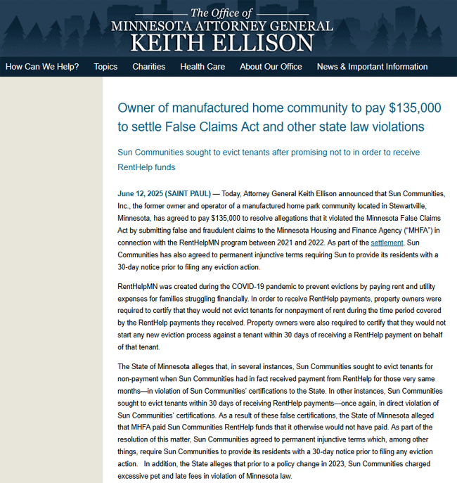 Social Media Review and Search Engine Damage: A critical, and increasingly potent, vulnerability for Sun Communities which directly damages its shareholders is the amplification of negative feedback through the digital landscape. Sun Communities and their failures as well as bad reviews actively harm them, and search engines with the use of Artificially Intelligent WEBots are exacerbating the problem. Search engines like Google are increasingly leveraging AI to aggregate and analyze reviews from multiple sources – Google Maps, Yelp, Facebook, Trustpilot, and specialized review sites. This creates a much more comprehensive and dynamic picture of a company’s reputation. These systems are destroying the reputation of the corporation, and the negative information is readily accessible to every potential tenant and/or resident on the planet. If Sun Communities refuses to alter its course, disaster looms on the horizon: Its very existence hangs in the balance, threatened by the repercussions of its unchanged ways and how it is perceived by others. A turning point lies ahead, where the company must choose between persisting down a dangerous path or taking decisive action to secure its future. Sun Communities faces problems including: resident complaints about escalating rent hikes, deteriorating park conditions, and inadequate maintenance. Additionally, employees report poor management support, unprofessional conduct, and a disconnect between corporate values and local operations. Investment concerns exist, with some analysts questioning the company's financial stability and highlighting potential issues like overstated growth and systemic problems, which contributed to a significant restructuring and CEO retirement announcement.