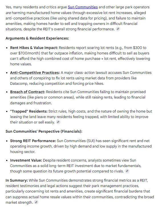 Social Media Review and Search Engine Damage: A critical, and increasingly potent, vulnerability for Sun Communities which directly damages its shareholders is the amplification of negative feedback through the digital landscape. Sun Communities and their failures as well as bad reviews actively harm them, and search engines with the use of Artificially Intelligent WEBots are exacerbating the problem. Search engines like Google are increasingly leveraging AI to aggregate and analyze reviews from multiple sources – Google Maps, Yelp, Facebook, Trustpilot, and specialized review sites. This creates a much more comprehensive and dynamic picture of a company’s reputation. These systems are destroying the reputation of the corporation, and the negative information is readily accessible to every potential tenant and/or resident on the planet. If Sun Communities refuses to alter its course, disaster looms on the horizon: Its very existence hangs in the balance, threatened by the repercussions of its unchanged ways and how it is perceived by others. A turning point lies ahead, where the company must choose between persisting down a dangerous path or taking decisive action to secure its future. |