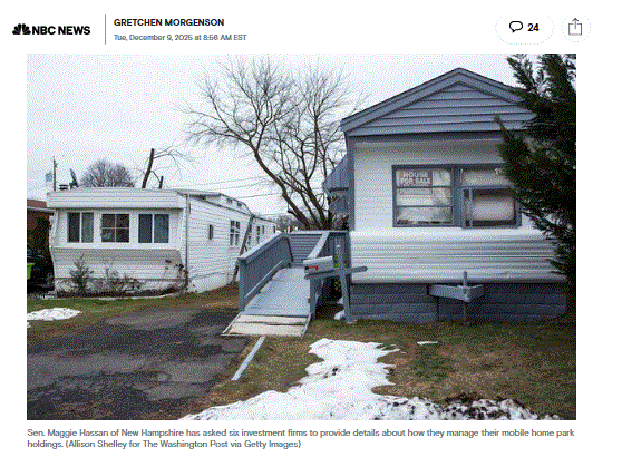 The firms that received letters include some of the biggest players in the industry: Alden Global Capital, owner of Homes of America; the BoaVida Group; Legacy Communities; Patriot Holdings; Philips International; and Sun Communities.